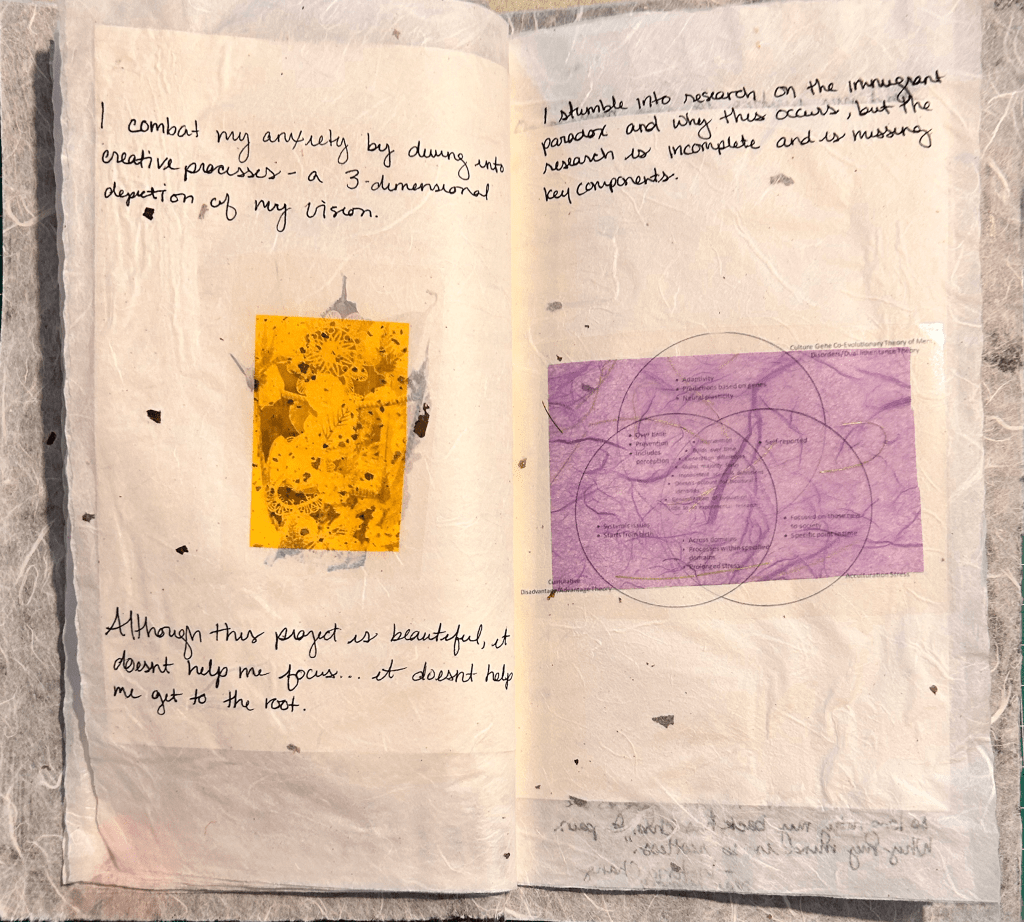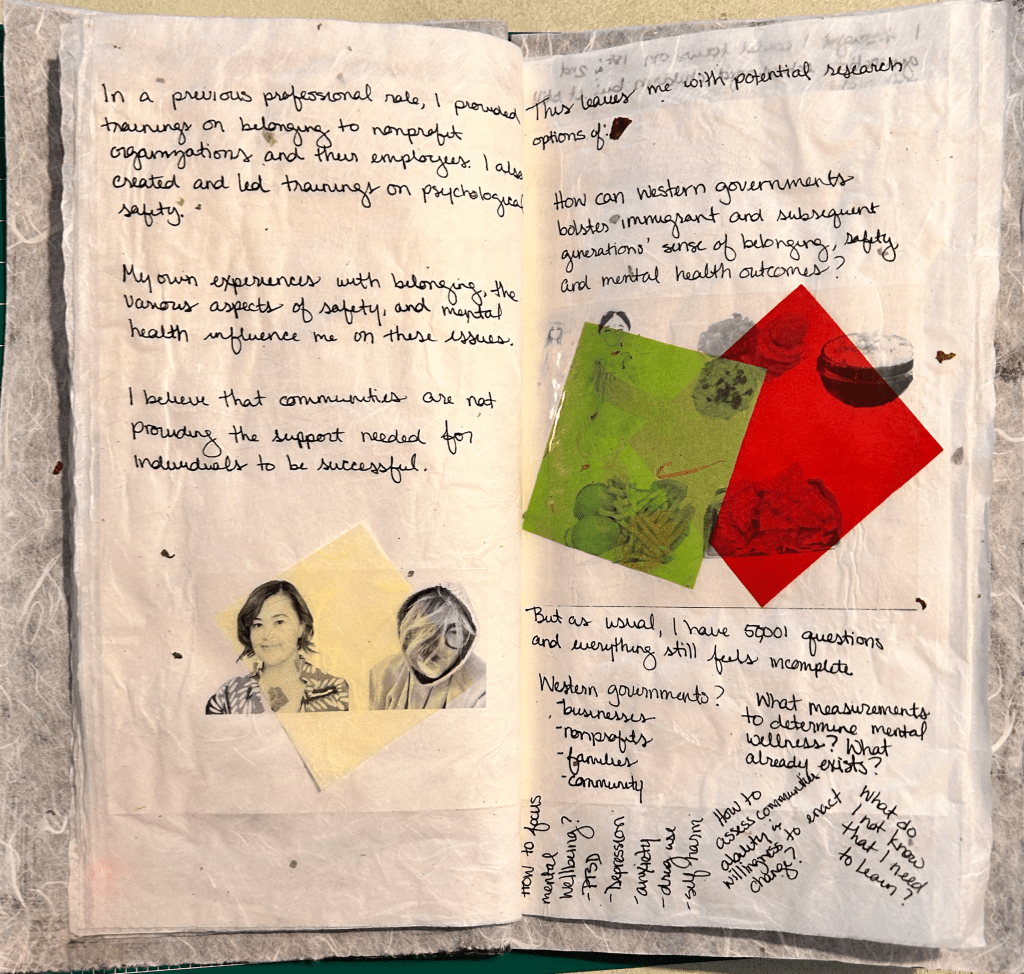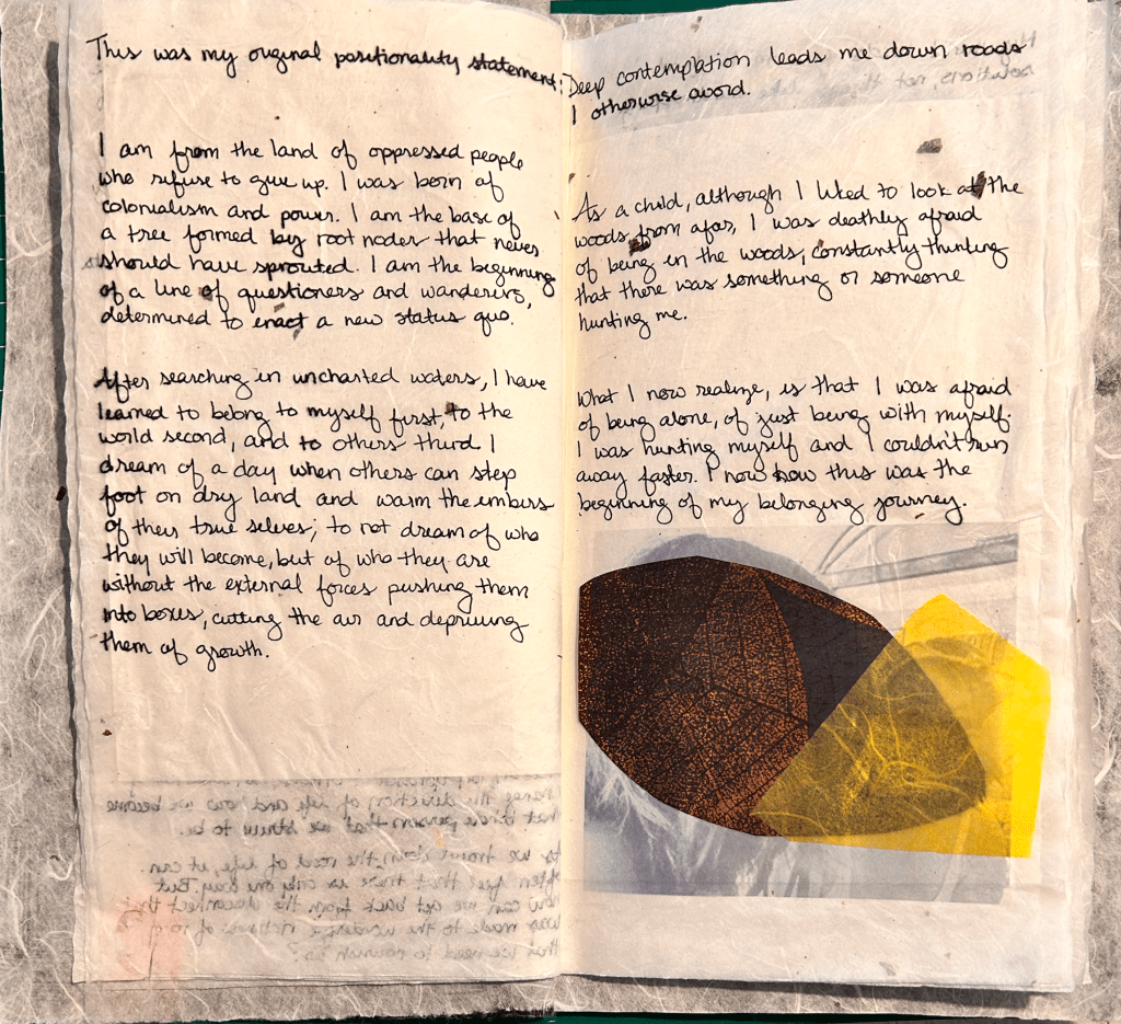 The identity squares I created were all abstract, varying from the figurative squares of the other participants. As I was creating each square, I worked with pieces of hanji and washi that called to me in that moment. Two of my squares represent the dichotomy of my being; I can be feminine yet strong as depicted by the purple and white square while the midnight and pink square emphasizes the darkness of my struggles with mental health while also emphasizing the importance of this divergence from the norm through the gold leaf. The navy piece embodies my shadow self; the self that I have embraced over time but in the past, forced to remain hidden. The white and tan square emphasizes my sometimes-fraught relationship with nature. The teal and gray square symbolizes the balance I try to find between structure and flow. After the completion of each square, I was surprised by how much each of these squares spoke to me about an aspect of my personal identity. I did not make each one thinking about my identity and it was not until after the creation, that I could see the tie to who I am. It is interesting to me that I can see the transformation that I am currently and have been undergoing over the past several months; of finding comfort in freedom and ownership of all aspects of myself instead of choosing to mask the aspects that others or I may find uncomfortable.