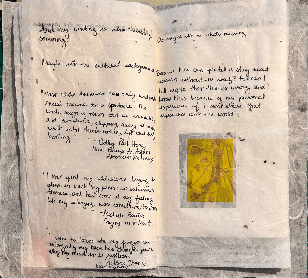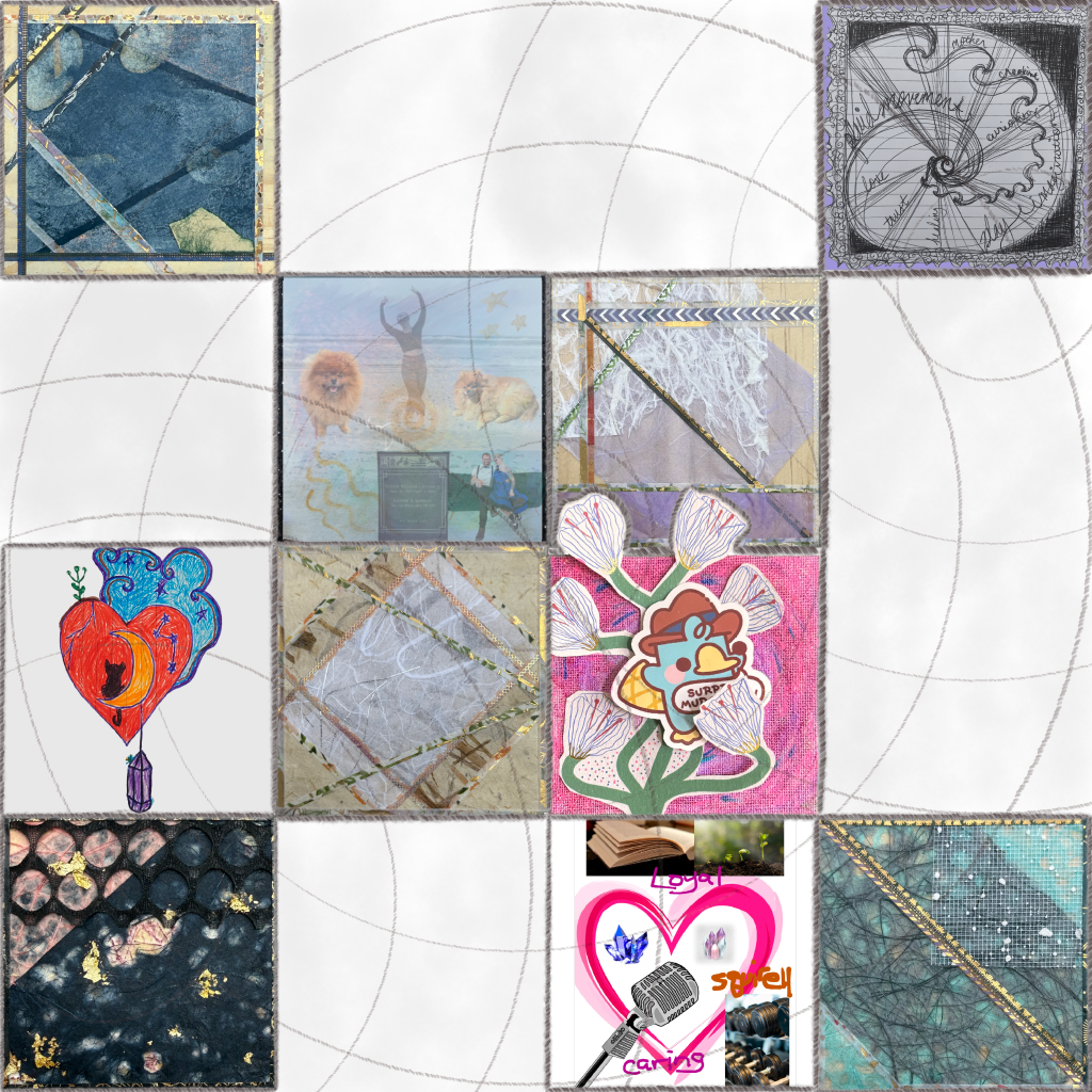 Each week over the span of five weeks, I spent time co-arting with a different individual who knows me personally. During each co-arting session, we met for one hour and followed the same prompt: within a square, create a visual depiction of something that people should know about you but may not. Each person chose to create their square differently, through collage, drawing, or digital collage. My squares were created using Korean hanji paper and Japanese washi tape mounted on a square birch woodblock as a form of homage to Korean American artists Jeong-Han and Choon-Hyang who make fine art from hanji that they create after personally harvesting the bark of the dak tree during trips to Korea. I then took a high resolution photo of each square and digitally knit them together to create a digital quilt. Creating a good quilt means adding pieces as they fit together, not making each piece fit. I left open spaces in the quilt for the pieces that are still to come, a metaphor for the pieces of ourselves that are in constant development. With Procreate and my Apple pencil, I added cotton texture to the blank spots, showing there is backing there, but a square still needs to be filled in. I then added stitches along the seams of each square and added a quilting pattern across the top, showing continuity even though there are pieces missing.